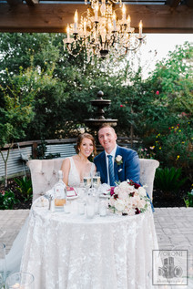 In two of our other beautiful weddings, our clients had us transition from the ceremony set up (chairs spaced in groups of 2) to the reception. Their guests enjoyed cocktail hour on the patio while our staff changed over the space to host the reception. They seated families or social bubbles together at tables and it was a wonderful evening with first dances, cake cutting, toasts, and celebration!